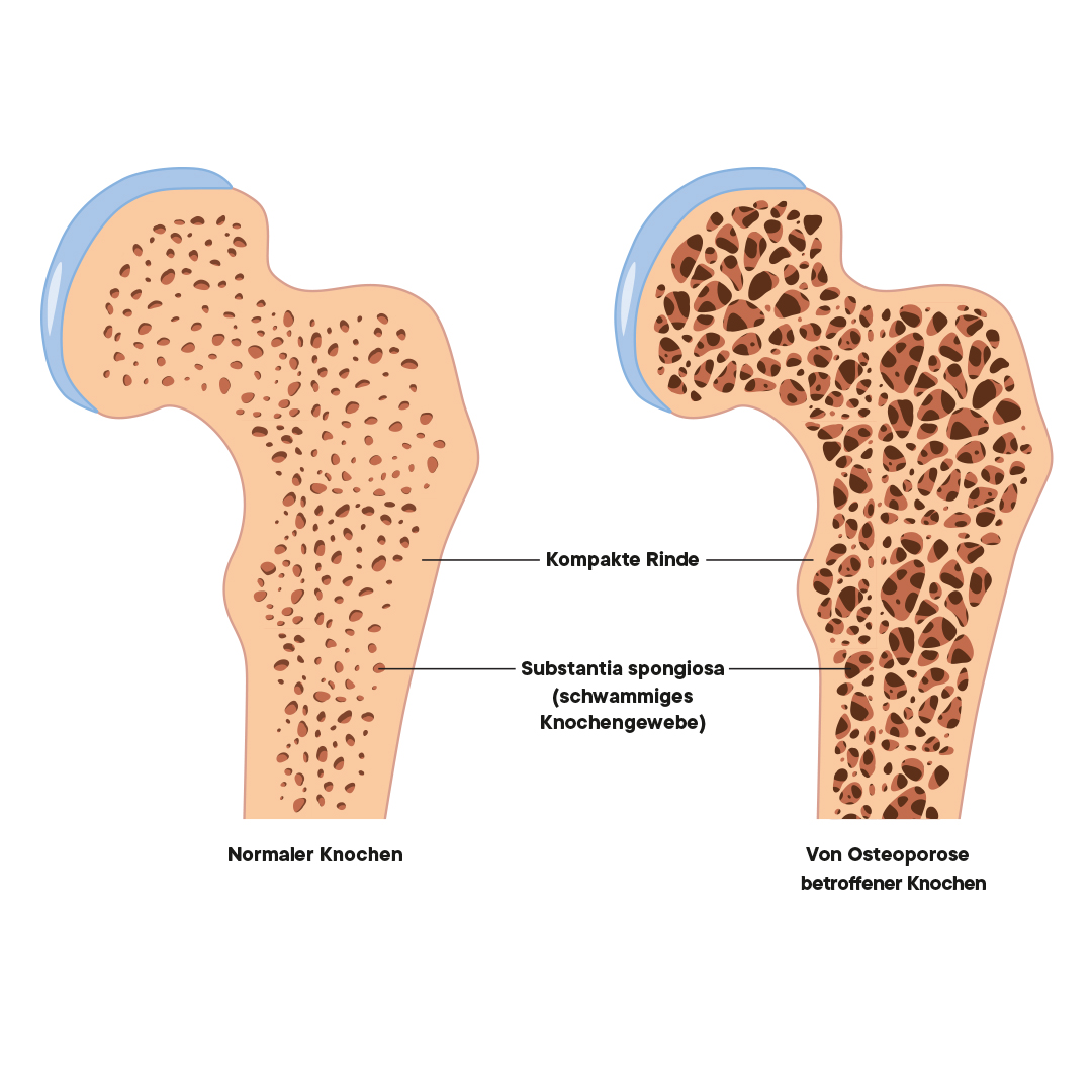 Das bedeutet: Die Knochen werden weniger dicht und belastbar. Das ist jedoch nicht weiter bedenklich – meist bleiben sie nämlich stabil genug, um den Alltagsbelastungen standzuhalten. Anders verhält es sich bei der Osteoporose: Hier ist das natürliche Gleichgewicht zwischen Aufbau und Abbau dauerhaft verschoben, wodurch der Knochenabbau deutlich stärker verläuft als beim normalen Alterungsprozess.