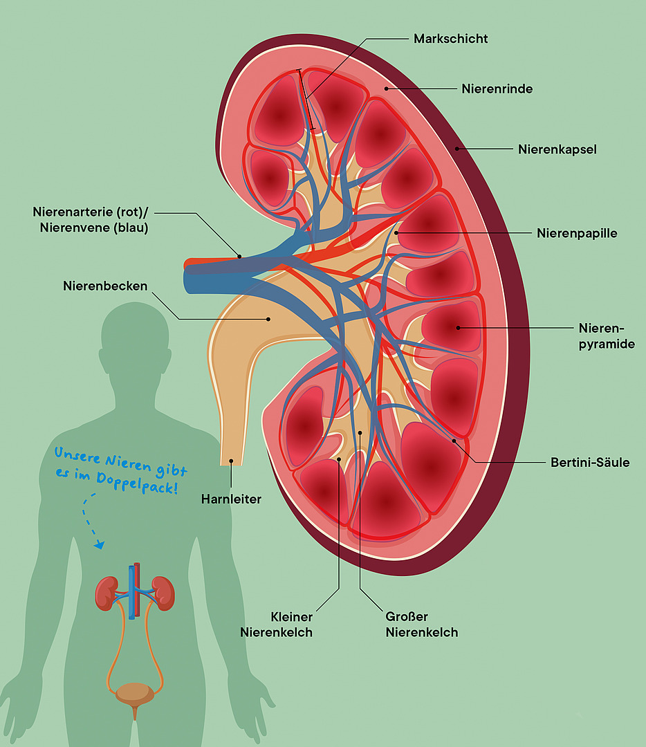 Rund 1.800 Liter Blut filtern unsere Nieren täglich. Dabei trennen sie brauchbare Stoffe von denen, die ausgeschieden werden müssen, wie Schadstoffe und Rückstände von Medikamenten. Eine Million Nephra (Mehrzahl von Nephron), die kleinsten funktionellen Einheiten der Nieren, sammeln die Abfallstoffe und vermischen sie mit Wasser – dabei entsteht Urin. Über den Harnleiter (Ureter) wird der Urin dann in die Harnblase geleitet und von dort aus dem Körper ausgeschieden.